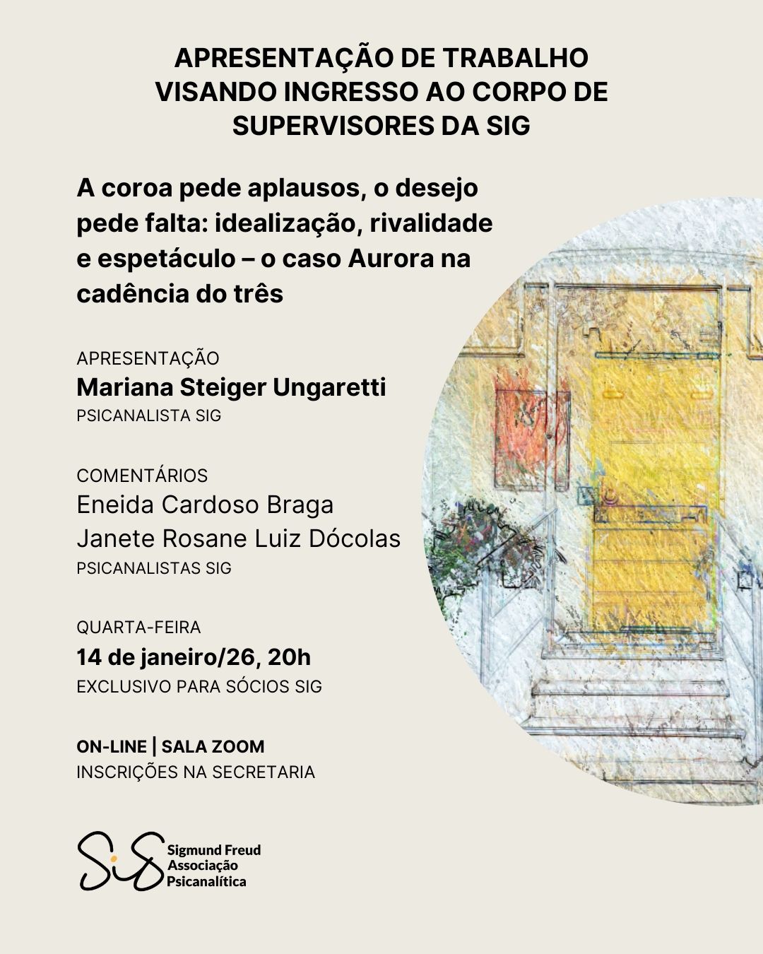 Convidamos todos os associados para assistirem a apresentação do trabalho de Mariana Steiger Ungaretti visando seu ingresso ao corpo de supervisores da Sig.