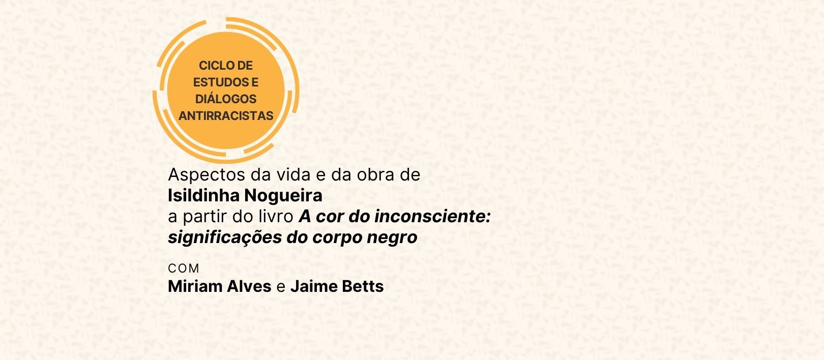 Para o segundo encontro deste ano, receberemos os psicanalistas Miriam Alves e Jaime Betts, que irão apresentar aspectos da vida e da obra de Isildinha Nogueira, a partir do livro “A cor do inconsciente: significações do corpo negro”, como um evento preparatório para a atividade que teremos em abril de 2026 com Isildinha Nogueira, na Sig.