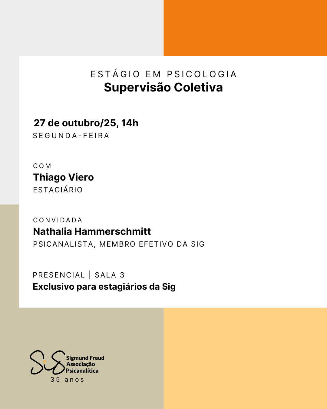 Mural 20 de outubro de 2025 Supervisão Coletiva – Estágio ShareTweetPin0shares Estágio em Psicologia: Supervisão Coletiva com Thiago Viero (estagiário). Convidada: Nathalia Hammerschmitt (Psicanalista, Membro Efetivo da Sig). 27 de outubro/25, segunda-feira, 14h às 15h30. Presencial | Sala 3. Exclusivo para estagiários da Sig Leia Mais